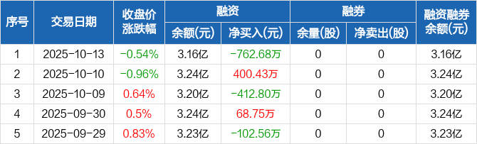 融资方面,当日融资买入1826.14万元,融资偿还2588.82万元,融资净偿还762.68万元。融券方面,融券卖出0股,融券偿还0股,融券余量0股,融券余额0元。融资融券余额合计3.16亿元。