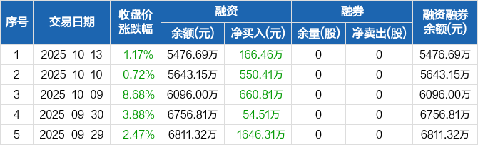 融资方面,当日融资买入1301.67万元,融资偿还1468.13万元,融资净偿还166.46万元,连续7日净偿还累计5598.3万元。融券方面,融券卖出0股,融券偿还0股,融券余量0股,融券余额0元。融资融券余额合计5476.69万元。