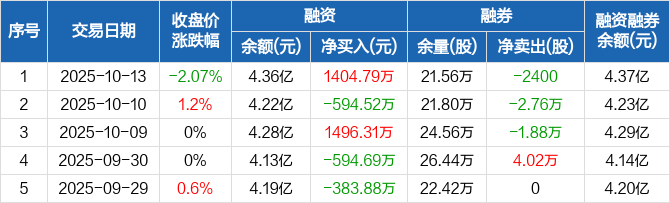 融资方面,当日融资买入3683.79万元,融资偿还2279万元,融资净买入1404.79万元。融券方面,融券卖出3200股,融券偿还5600股,融券余量21.56万股,融券余额71.36万元。融资融券余额合计4.37亿元。