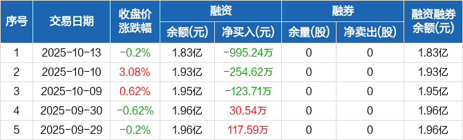 融资方面,当日融资买入660.47万元,融资偿还1655.71万元,融资净偿还995.24万元,连续3日净偿还累计1373.57万元。融券方面,融券卖出0股,融券偿还0股,融券余量0股,融券余额0元。融资融券余额合计1.83亿元。