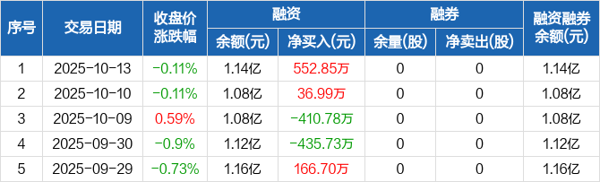融资方面,当日融资买入1121.73万元,融资偿还568.88万元,融资净买入552.85万元。融券方面,融券卖出0股,融券偿还0股,融券余量0股,融券余额0元。融资融券余额合计1.14亿元。