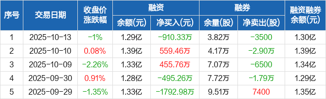 融资方面,当日融资买入1162.18万元,融资偿还2072.52万元,融资净偿还910.33万元。融券方面,融券卖出1200股,融券偿还4700股,融券余量3.82万股,融券余额49.09万元。融资融券余额合计1.3亿元。