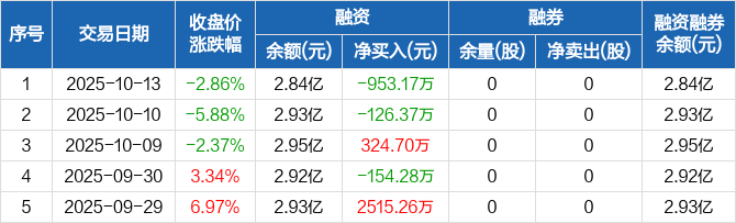 融资方面,当日融资买入2223.13万元,融资偿还3176.31万元,融资净偿还953.17万元。融券方面,融券卖出0股,融券偿还0股,融券余量0股,融券余额0元。融资融券余额合计2.84亿元。