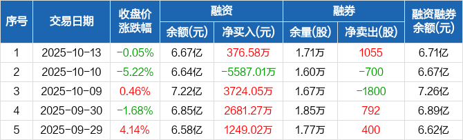 融资方面,当日融资买入1.04亿元,融资偿还1亿元,融资净买入376.58万元。融券方面,融券卖出1255股,融券偿还200股,融券余量1.71万股,融券余额370.97万元。融资融券余额合计6.71亿元。
