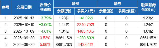 融资方面,当日融资买入994.64万元,融资偿还1035.66万元,融资净偿还41.02万元。融券方面,融券卖出0股,融券偿还0股,融券余量0股,融券余额0元。融资融券余额合计1.23亿元。