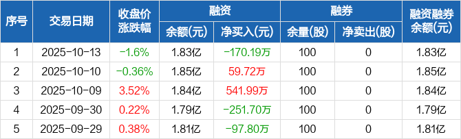 融资方面,当日融资买入680.69万元,融资偿还850.89万元,融资净偿还170.19万元。融券方面,融券卖出0股,融券偿还0股,融券余量100股,融券余额1357元。融资融券余额合计1.83亿元。