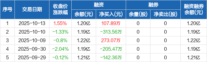 融资方面,当日融资买入962.12万元,融资偿还854.24万元,融资净买入107.89万元。融券方面,融券卖出0股,融券偿还0股,融券余量0股,融券余额0元。融资融券余额合计1.2亿元。