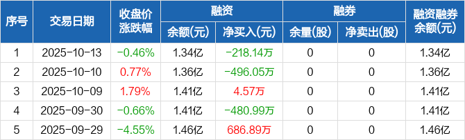 融资方面,当日融资买入610.31万元,融资偿还828.45万元,融资净偿还218.14万元。融券方面,融券卖出0股,融券偿还0股,融券余量0股,融券余额0元。融资融券余额合计1.34亿元。