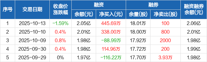 融资方面,当日融资买入776.78万元,融资偿还331.09万元,融资净买入445.69万元。融券方面,融券卖出200股,融券偿还100股,融券余量18.01万股,融券余额44.66万元。融资融券余额合计2.06亿元。