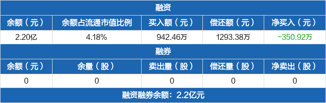 融资方面,当日融资买入942.46万元,融资偿还1293.38万元,融资净偿还350.92万元。融券方面,融券卖出0股,融券偿还0股,融券余量0股,融券余额0元。融资融券余额合计2.2亿元。