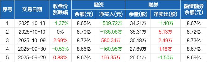 融资方面,当日融资买入319.58万元,融资偿还829.3万元,融资净偿还509.72万元。融券方面,融券卖出1.24万股,融券偿还2.34万股,融券余量34.21万股,融券余额197.39万元。融资融券余额合计8.67亿元。