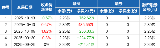 融资方面,当日融资买入811.67万元,融资偿还1574.29万元,融资净偿还762.62万元。融券方面,融券卖出0股,融券偿还0股,融券余量0股,融券余额0元。融资融券余额合计2.23亿元。