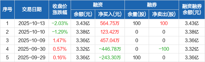 融资方面,当日融资买入1260.97万元,融资偿还696.22万元,融资净买入564.75万元,连续3日净买入累计1145.21万元。融券方面,融券卖出100股,融券偿还0股,融券余量100股,融券余额2408元。融资融券余额合计3.43亿元。