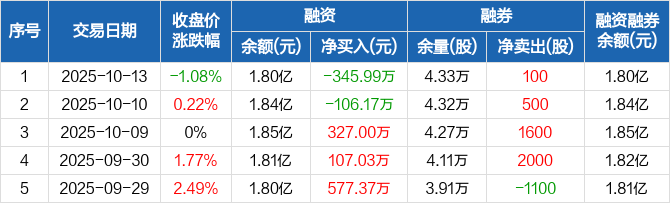 融资方面,当日融资买入907.05万元,融资偿还1253.04万元,融资净偿还345.99万元。融券方面,融券卖出700股,融券偿还600股,融券余量4.33万股,融券余额19.74万元。融资融券余额合计1.8亿元。