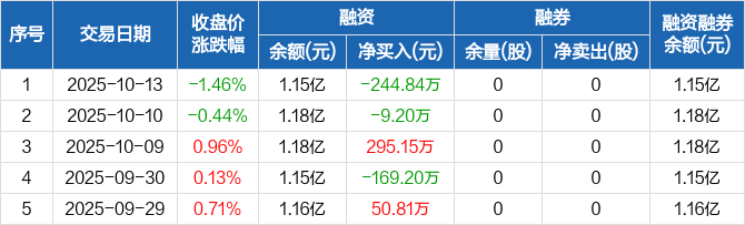 融资方面,当日融资买入357.83万元,融资偿还602.67万元,融资净偿还244.84万元。融券方面,融券卖出0股,融券偿还0股,融券余量0股,融券余额0元。融资融券余额合计1.15亿元。