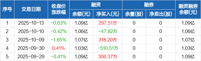 融资方面,当日融资买入742.59万元,融资偿还445.08万元,融资净买入297.51万元。融券方面,融券卖出0股,融券偿还0股,融券余量0股,融券余额0元。融资融券余额合计1.09亿元。
