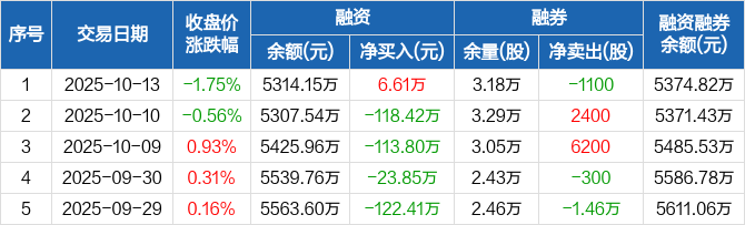 融资方面,当日融资买入421.29万元,融资偿还414.69万元,融资净买入6.61万元。融券方面,融券卖出300股,融券偿还1400股,融券余量3.18万股,融券余额60.67万元。融资融券余额合计5374.82万元。