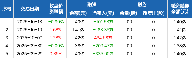 融资方面,当日融资买入976.87万元,融资偿还1078.45万元,融资净偿还101.58万元。融券方面,融券卖出0股,融券偿还0股,融券余量100股,融券余额1195元。融资融券余额合计1.4亿元。