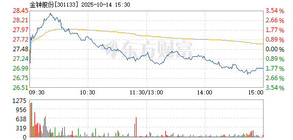 金钟股份盘中快速反弹,5分钟内涨幅超过2%,截至9点30分,报27.68元,成交186.54万元,换手率0.07%。