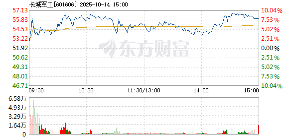 10月14日,长城军工盘中涨幅达5%,截至9点32分,报54.54元,成交4.86亿元,换手率1.26%。
