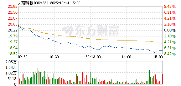 10月14日,兴森科技盘中跌幅达5%,截至10点40分,报19.2元,成交10.19亿元,换手率3.40%。