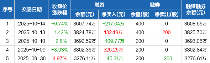 融资方面,当日融资买入246.36万元,融资偿还463.4万元,融资净偿还217.04万元。融券方面,融券卖出0股,融券偿还0股,融券余量400股,融券余额9104元。融资融券余额合计3608.65万元。