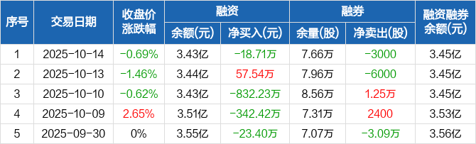 融资方面,当日融资买入401.84万元,融资偿还420.54万元,融资净偿还18.71万元。融券方面,融券卖出1400股,融券偿还4400股,融券余量7.66万股,融券余额144.28万元。融资融券余额合计3.45亿元。
