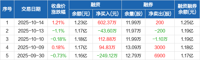 融资方面,当日融资买入1653.51万元,融资偿还1051.14万元,融资净买入602.37万元。融券方面,融券卖出900股,融券偿还700股,融券余量11.99万股,融券余额130.69万元。融资融券余额合计1.25亿元。