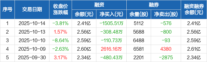 融资方面,当日融资买入2094.04万元,融资偿还3599.55万元,融资净偿还1505.51万元,连续3日净偿还累计1924.71万元。融券方面,融券卖出200股,融券偿还776股,融券余量5112股,融券余额48.72万元。融资融券余额合计2.41亿元。