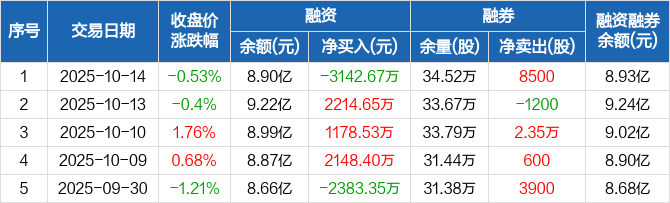 融资方面,当日融资买入4810.02万元,融资偿还7952.69万元,融资净偿还3142.67万元。融券方面,融券卖出9300股,融券偿还800股,融券余量34.52万股,融券余额257.52万元。融资融券余额合计8.93亿元。