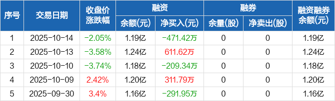 融资方面,当日融资买入1006.68万元,融资偿还1478.1万元,融资净偿还471.42万元。融券方面,融券卖出0股,融券偿还0股,融券余量0股,融券余额0元。融资融券余额合计1.19亿元。