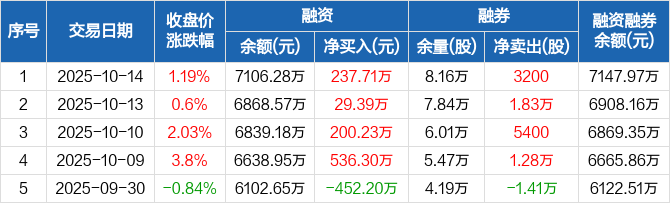 融资方面,当日融资买入1130.49万元,融资偿还892.78万元,融资净买入237.71万元,连续4日净买入累计1003.62万元。融券方面,融券卖出3300股,融券偿还100股,融券余量8.16万股,融券余额41.7万元。融资融券余额合计7147.97万元。