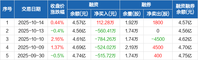融资方面,当日融资买入1908.9万元,融资偿还1796.62万元,融资净买入112.28万元。融券方面,融券卖出5200股,融券偿还3400股,融券余量1.92万股,融券余额43.6万元。融资融券余额合计4.57亿元。