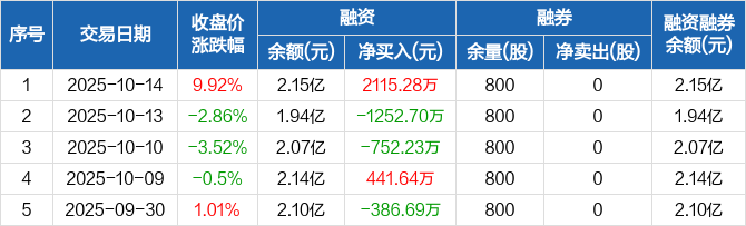 融资方面,当日融资买入6437.21万元,融资偿还4321.93万元,融资净买入2115.28万元。融券方面,融券卖出0股,融券偿还0股,融券余量800股,融券余额3280元。融资融券余额合计2.15亿元。