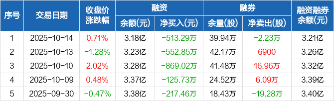 融资方面,当日融资买入1080.43万元,融资偿还1593.72万元,融资净偿还513.29万元,连续5日净偿还累计2278.34万元。融券方面,融券卖出1800股,融券偿还2.41万股,融券余量39.94万股,融券余额341.49万元。融资融券余额合计3.21亿元。