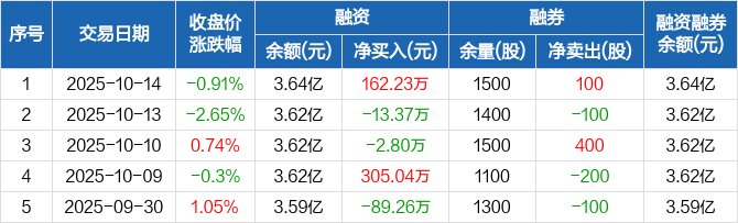 融资方面,当日融资买入1037.51万元,融资偿还875.28万元,融资净买入162.23万元。融券方面,融券卖出100股,融券偿还0股,融券余量1500股,融券余额9825元。融资融券余额合计3.64亿元。