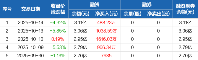 融资方面,当日融资买入5157.73万元,融资偿还4669.49万元,融资净买入488.23万元,连续8日净买入累计9005.93万元。融券方面,融券卖出0股,融券偿还0股,融券余量0股,融券余额0元。融资融券余额合计3.11亿元。