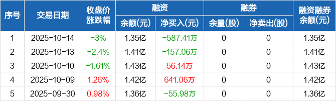 融资方面,当日融资买入978.58万元,融资偿还1565.99万元,融资净偿还587.41万元。融券方面,融券卖出0股,融券偿还0股,融券余量0股,融券余额0元。融资融券余额合计1.35亿元。