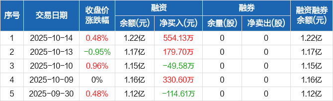 融资方面,当日融资买入1047.31万元,融资偿还493.18万元,融资净买入554.13万元。融券方面,融券卖出0股,融券偿还0股,融券余量0股,融券余额0元。融资融券余额合计1.22亿元。