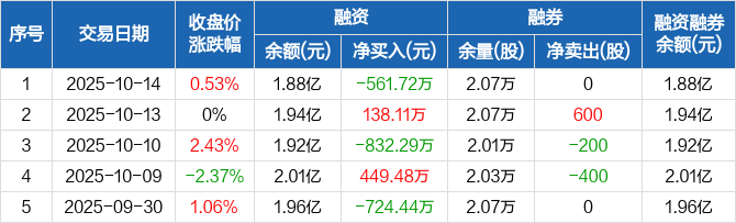 融资方面,当日融资买入371.06万元,融资偿还932.78万元,融资净偿还561.72万元。融券方面,融券卖出0股,融券偿还0股,融券余量2.07万股,融券余额7.91万元。融资融券余额合计1.88亿元。