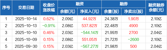 融资方面,当日融资买入1338.34万元,融资偿还1293.42万元,融资净买入44.92万元。融券方面,融券卖出1.94万股,融券偿还400股,融券余量24.38万股,融券余额159.45万元。融资融券余额合计2.1亿元。
