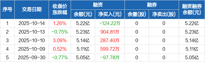 融资方面,当日融资买入1020.37万元,融资偿还1144.59万元,融资净偿还124.22万元。融券方面,融券卖出0股,融券偿还0股,融券余量0股,融券余额0元。融资融券余额合计5.22亿元。