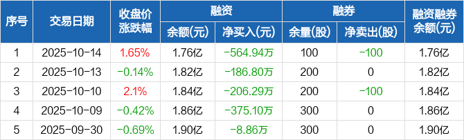 融资方面,当日融资买入3413.81万元,融资偿还3978.75万元,融资净偿还564.94万元,连续5日净偿还累计1341.99万元。融券方面,融券卖出100股,融券偿还200股,融券余量100股,融券余额741元。融资融券余额合计1.76亿元。