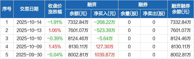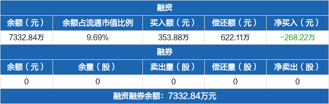 融资方面,当日融资买入353.88万元,融资偿还622.11万元,融资净偿还268.22万元,连续3日净偿还累计797.26万元。融券方面,融券卖出0股,融券偿还0股,融券余量0股,融券余额0元。融资融券余额合计7332.84万元。