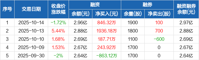 融资方面,当日融资买入2265.41万元,融资偿还1419.1万元,融资净买入846.32万元,连续4日净买入累计3214.12万元。融券方面,融券卖出100股,融券偿还0股,融券余量1900股,融券余额1.2万元。融资融券余额合计2.97亿元。