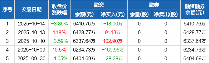 融资方面,当日融资买入840.95万元,融资偿还858.95万元,融资净偿还18万元。融券方面,融券卖出0股,融券偿还0股,融券余量0股,融券余额0元。融资融券余额合计6410.76万元。