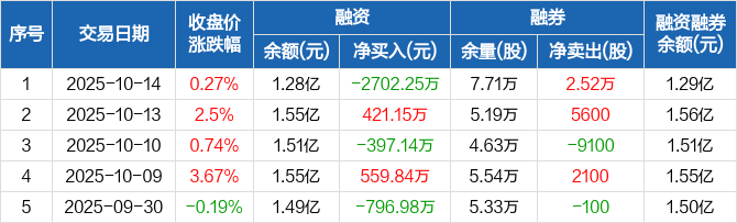 融资方面,当日融资买入1517.76万元,融资偿还4220.01万元,融资净偿还2702.25万元,净偿还额创12个月新高。融券方面,融券卖出2.9万股,融券偿还3800股,融券余量7.71万股,融券余额85.74万元。融资融券余额合计1.29亿元。