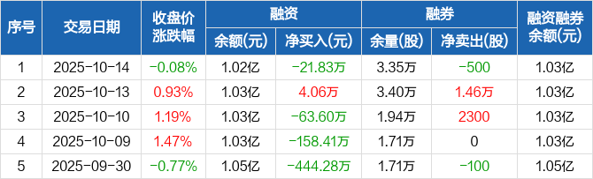 融资方面,当日融资买入1309.6万元,融资偿还1331.43万元,融资净偿还21.83万元。融券方面,融券卖出100股,融券偿还600股,融券余量3.35万股,融券余额40.17万元。融资融券余额合计1.03亿元。
