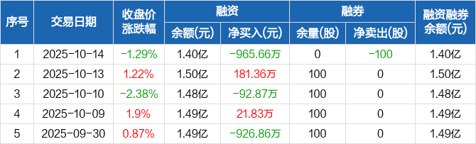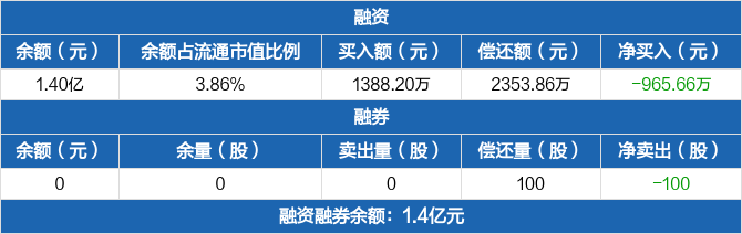 融资方面,当日融资买入1388.2万元,融资偿还2353.86万元,融资净偿还965.66万元。融券方面,融券卖出0股,融券偿还100股,融券余量0股,融券余额0元。融资融券余额合计1.4亿元。