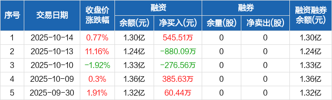 融资方面,当日融资买入1088.04万元,融资偿还542.53万元,融资净买入545.51万元。融券方面,融券卖出0股,融券偿还0股,融券余量0股,融券余额0元。融资融券余额合计1.3亿元。